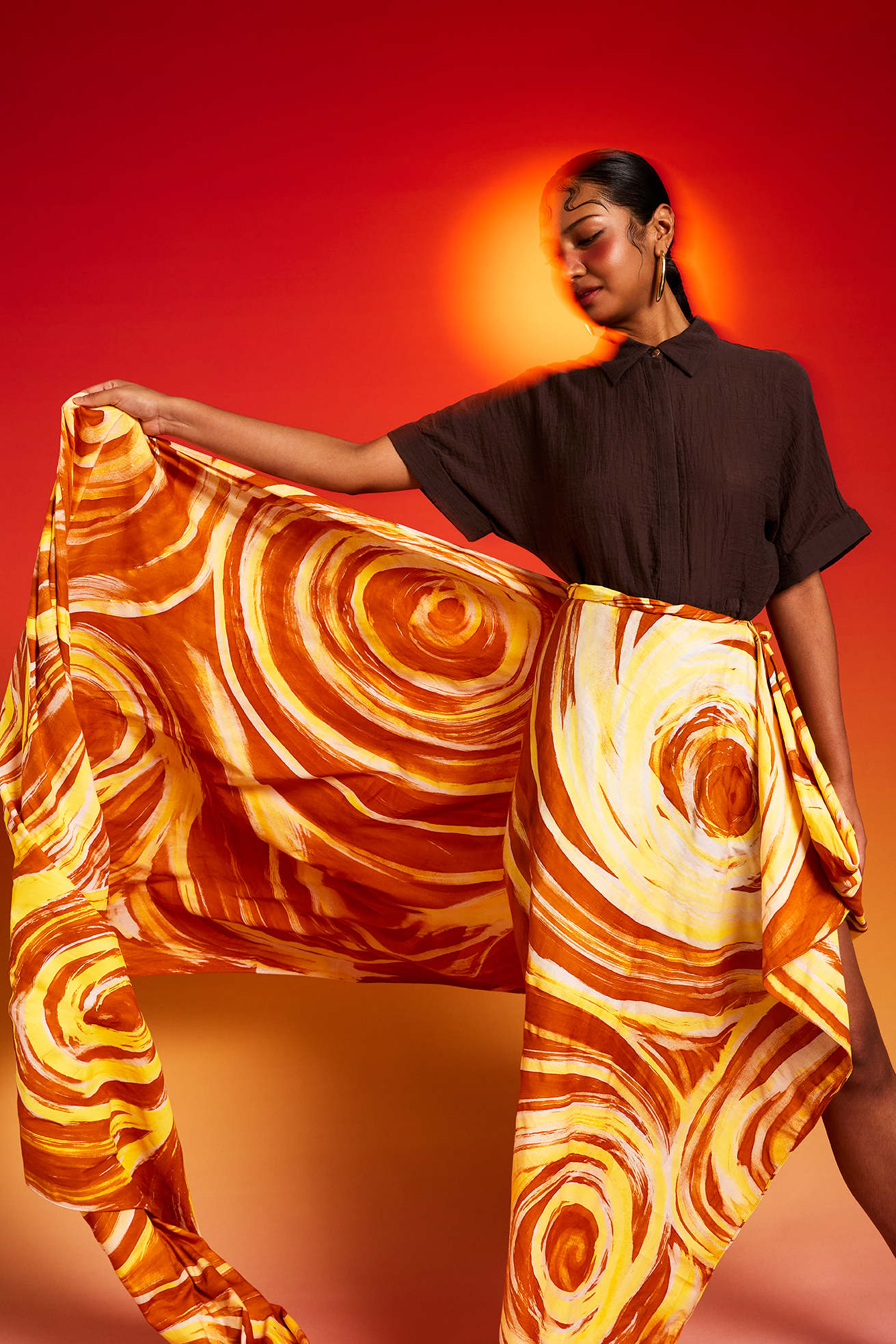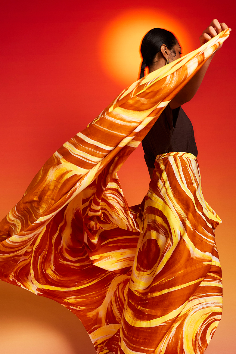 The sarung patterning takes its cue from the sun, a playful map of rays and rising heat. Its layered motifs enable colour transitions, from base tones to high intensity overlays under elevated UV levels. “It was exciting to see the textile come alive in the sunlight—as if revealing hidden truths,” reflects designer Fern Chua. “Batik is inherently tied to nature—not just through its motifs, but in its process. The fabric breathes, the wax resists, and the dye reacts. In a time when the planet is heating up, batik becomes a medium for reflection; climate change is not something distant, it’s happening right here, shaping our lives and well-being.”