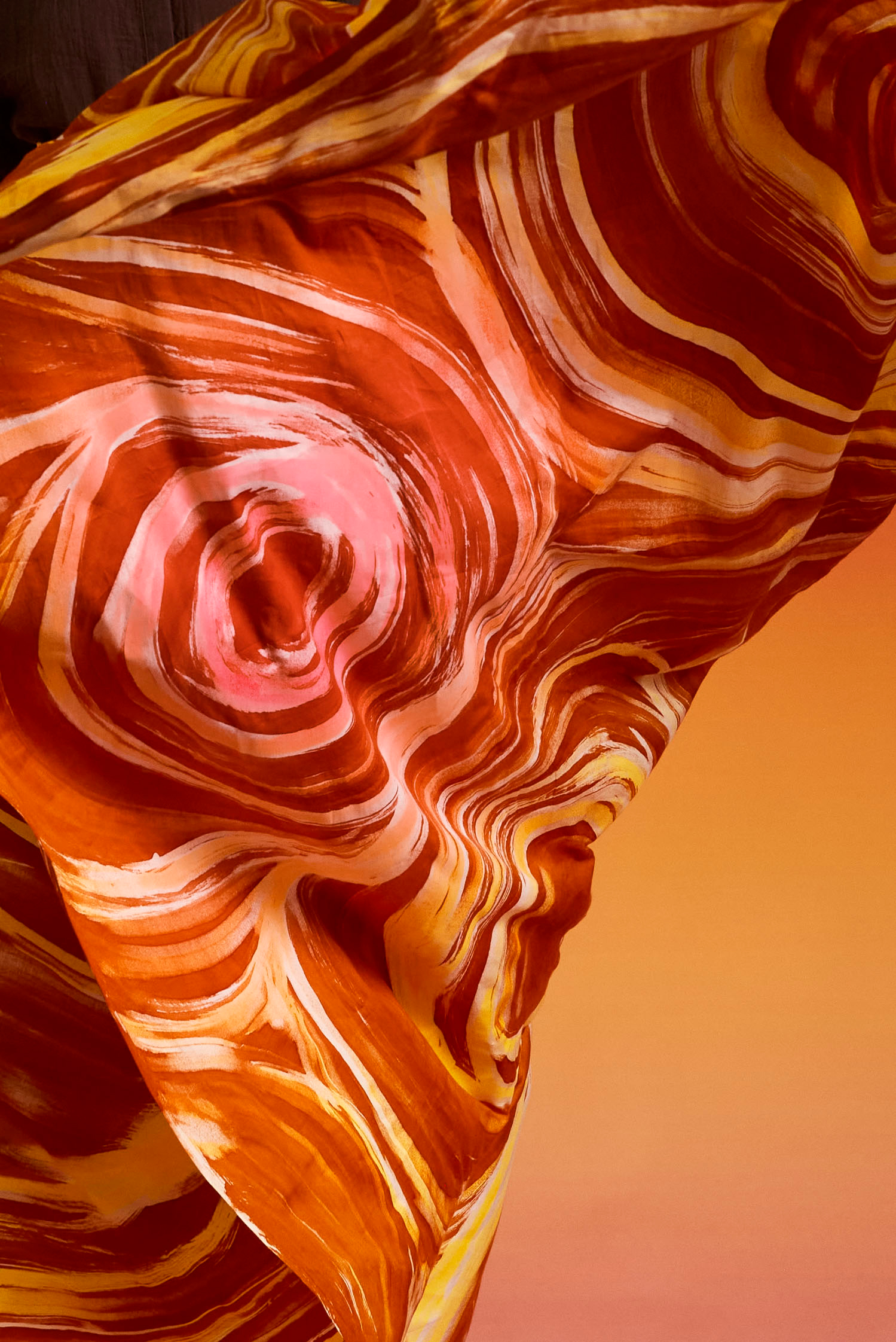 Printed with UV-reactive ink, hidden solar-inspired batik motifs emerge when the fabric is “sun-kissed”. Shifting from orange to clear red on very sunny days, it gives the wearer—and those around them—an immediate, visceral signal: maybe it’s time to step into the shade. Lightweight and responsive, this tropical staple comes alive in the sun, transforming a familiar garment into a dynamic, heat-smart companion.