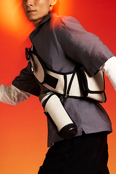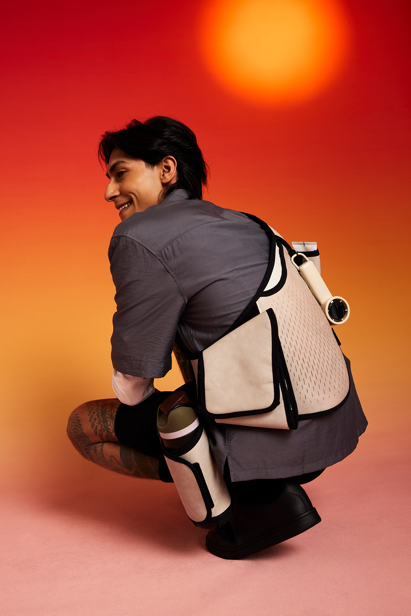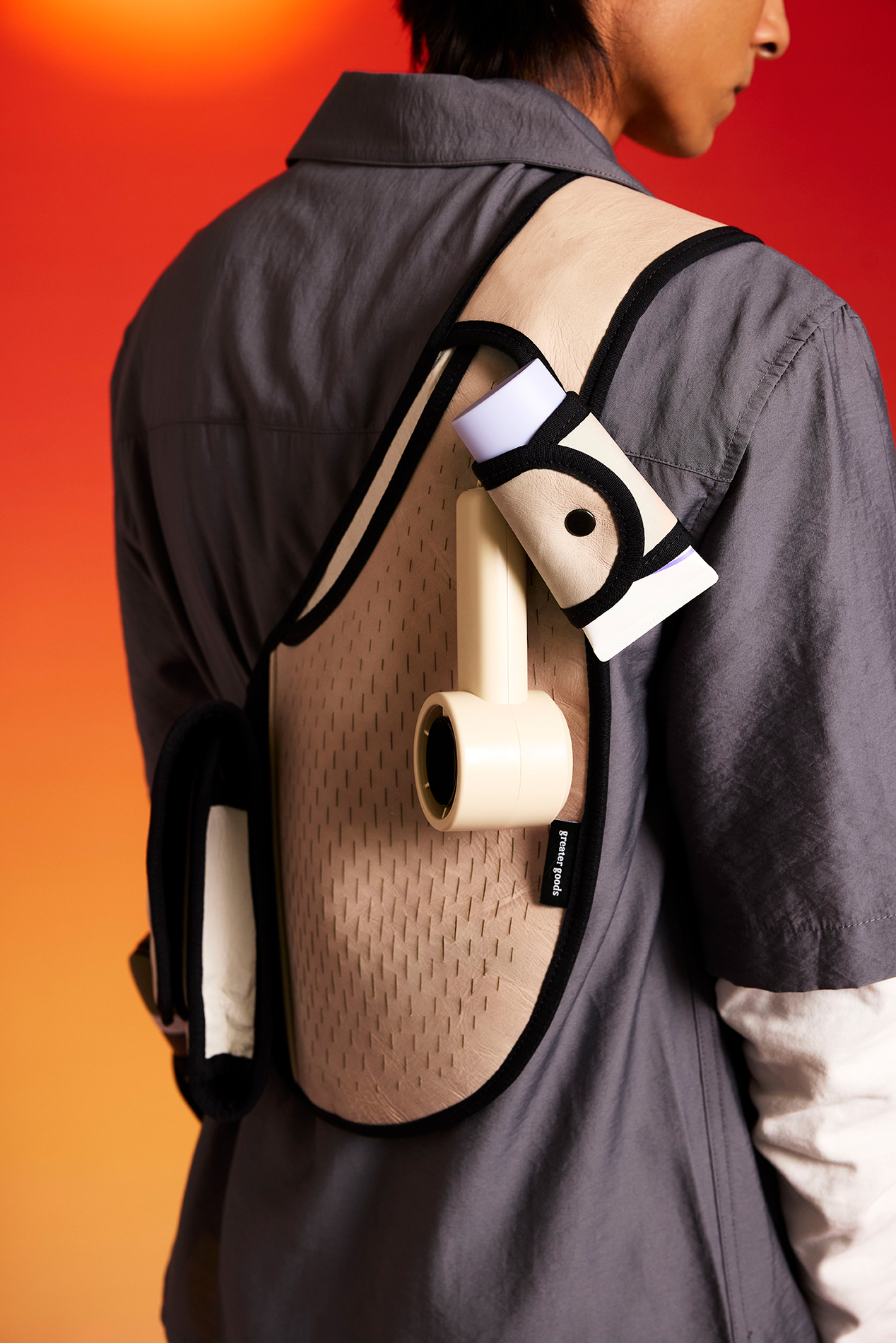 THE SOLAR HARNESS rethinks personal carry as adaptive protection. Designed with detachable modules for all your sun essentials — water bottle, sunscreen, hat, umbrella, and sunglasses — it allows wearers to configure the strap according to the weather. An ergonomic crossbody form keeps movement effortless through dense urban spaces, moving with you, not against you.