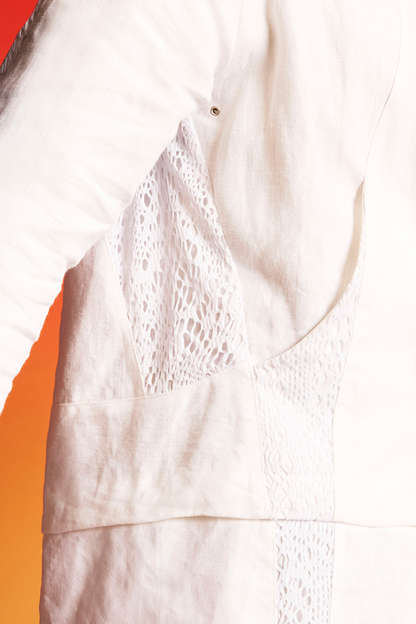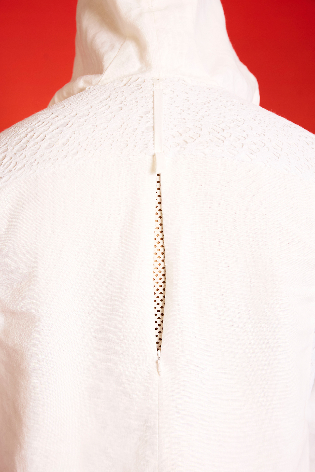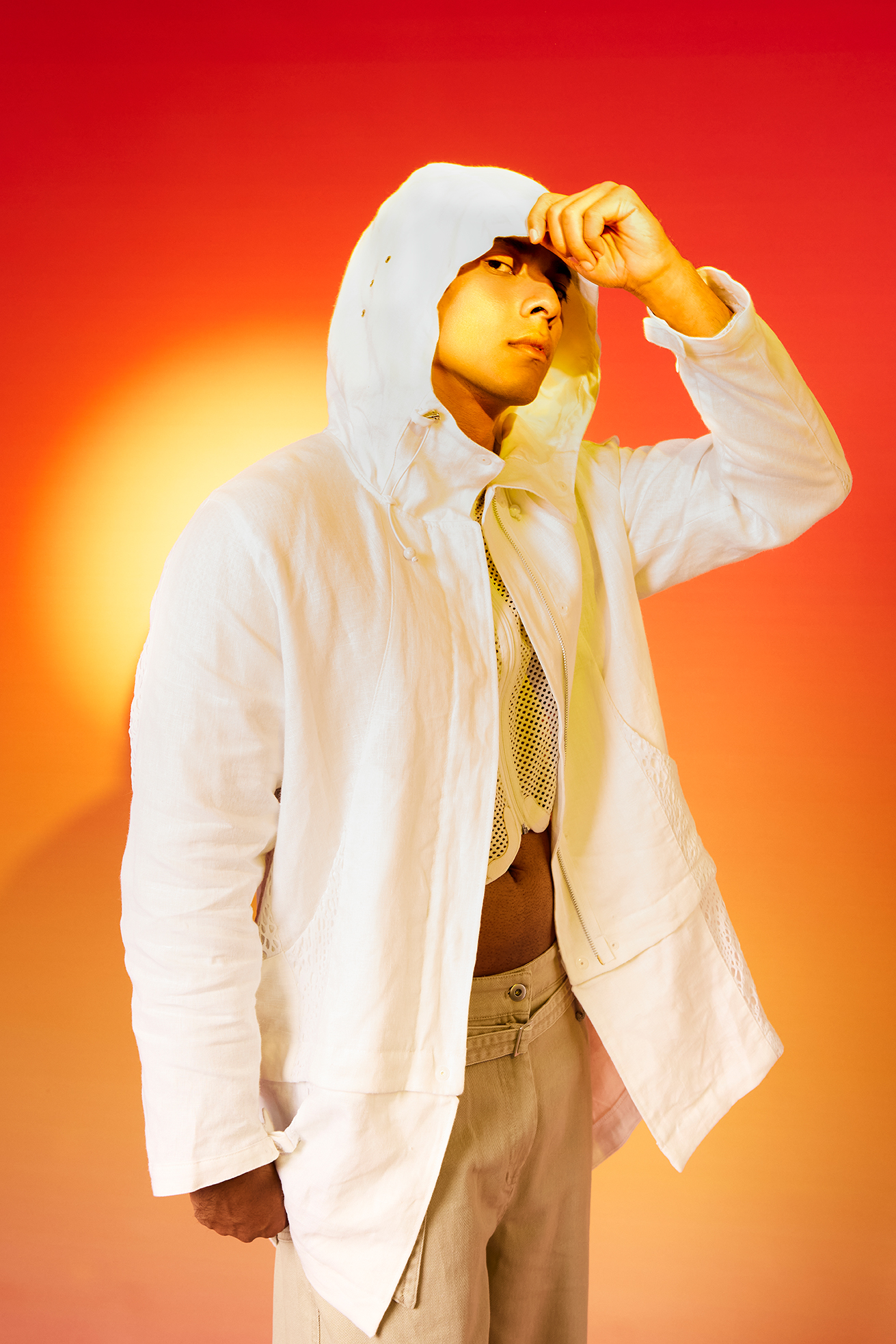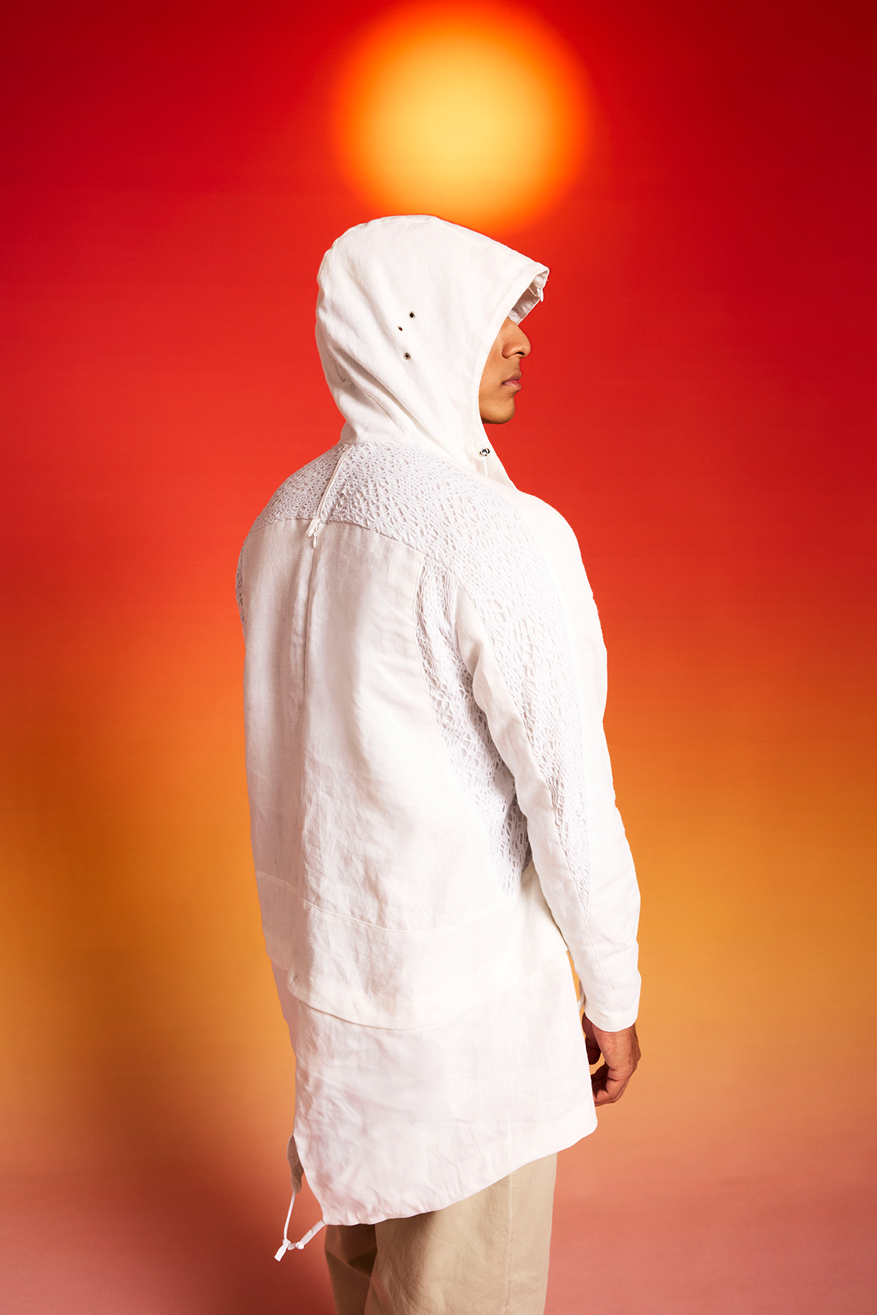 “The white colour palette and embroidered linen fabric are inspired by traditional garments worn in hot climates, which are usually made from natural fibres,“ says designer Jaimus Tailor, who has reinterpreted the codes of performance garments with an atypically graceful slant — to craft an agile, unisex garment with an all-weather appeal. Jaimus shows that true adaptation isn’t about hiding from the elements, but evolving with them.