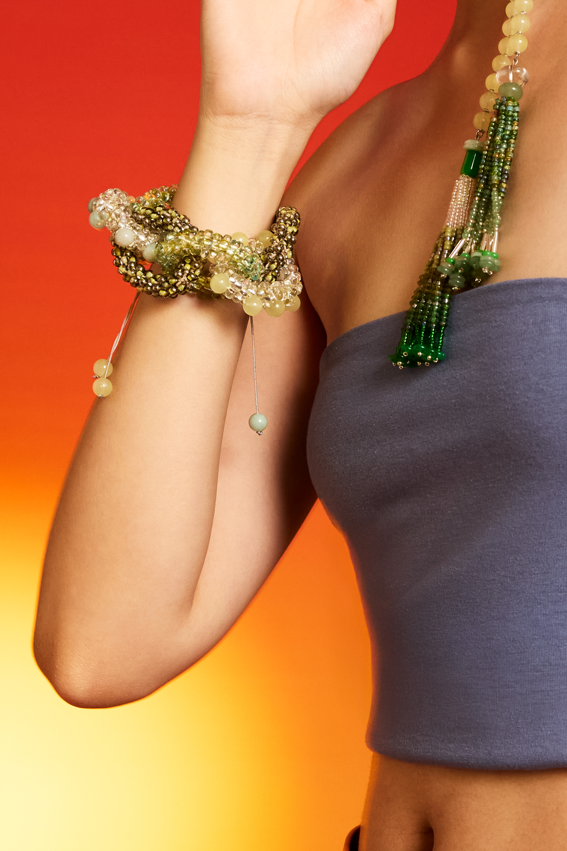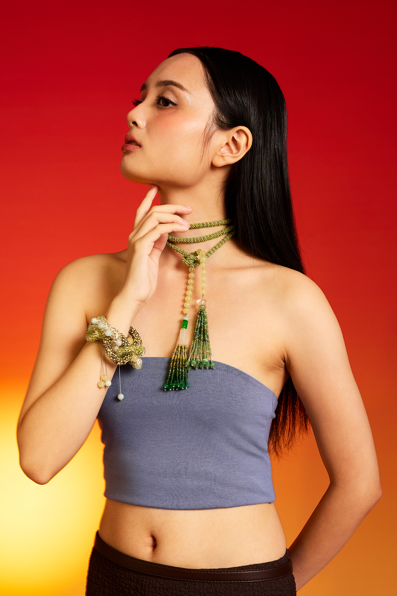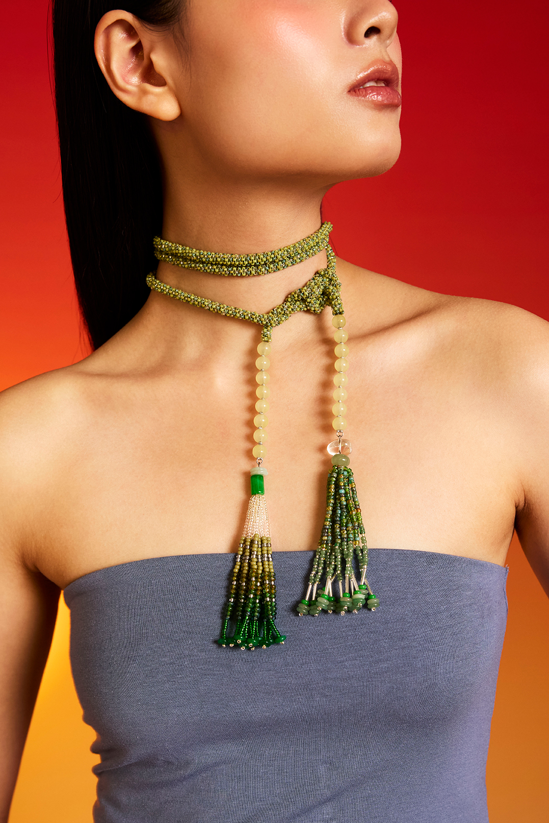 Long revered for both its ornamental and symbolic qualities, jade also possesses excellent thermal conductivity, which allows it to absorb and dissipate heat from the skin rapidly. Applied here as the primary material for an accessory that efficiently targets the body’s hottest zone, the result is a statement neckpiece that looks just as cool as it feels. The intricate tassels draw from traditional talismanic objects in Chinese culture, but also serve a practical purpose. The multitude of fine strands allow for more contact between the skin and the jade’s surface, which in turn cools the body further, faster.